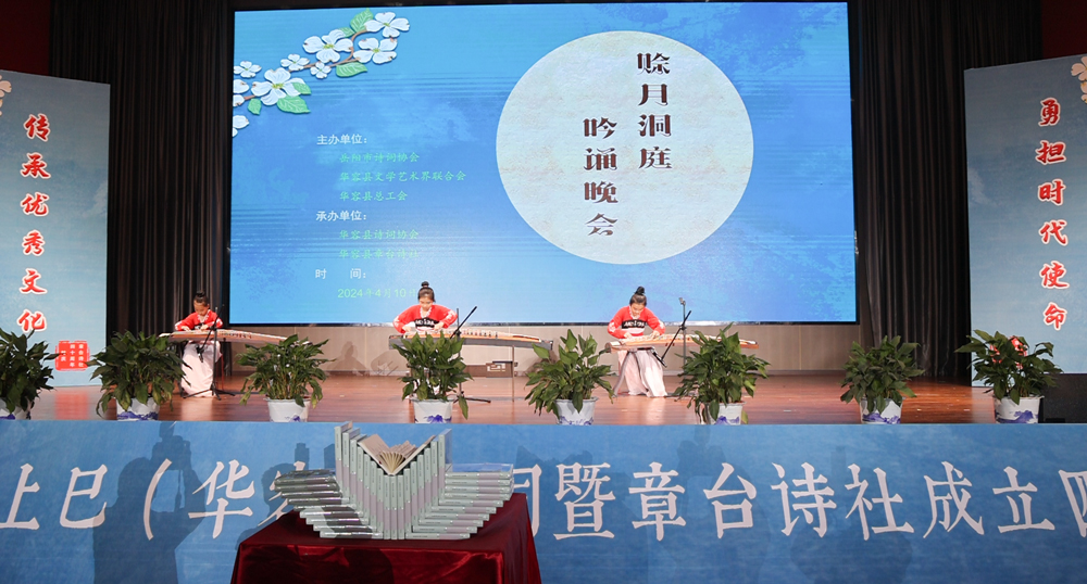 华容融媒体中心讯(记者 黄欧 王帅)4月10日,《华容当代诗人作品选》赠书仪式暨“赊月洞庭” 诗词吟诵晚会举行。湖南省诗词协会副会长易庆安,湖南省文史馆馆员熊东遨,湖南省诗词协会会长助理李文勇,湖南省潇湘散曲社常务副社长、岳阳市诗词协会会长王伊亮,益阳市诗词家协会主席郑人,华容县政协主席张大宏,县人民政府副县长毛彦景出席活动。来自长沙、岳阳、荆州、益阳、常德等市县的诗词协会成员参加活动。