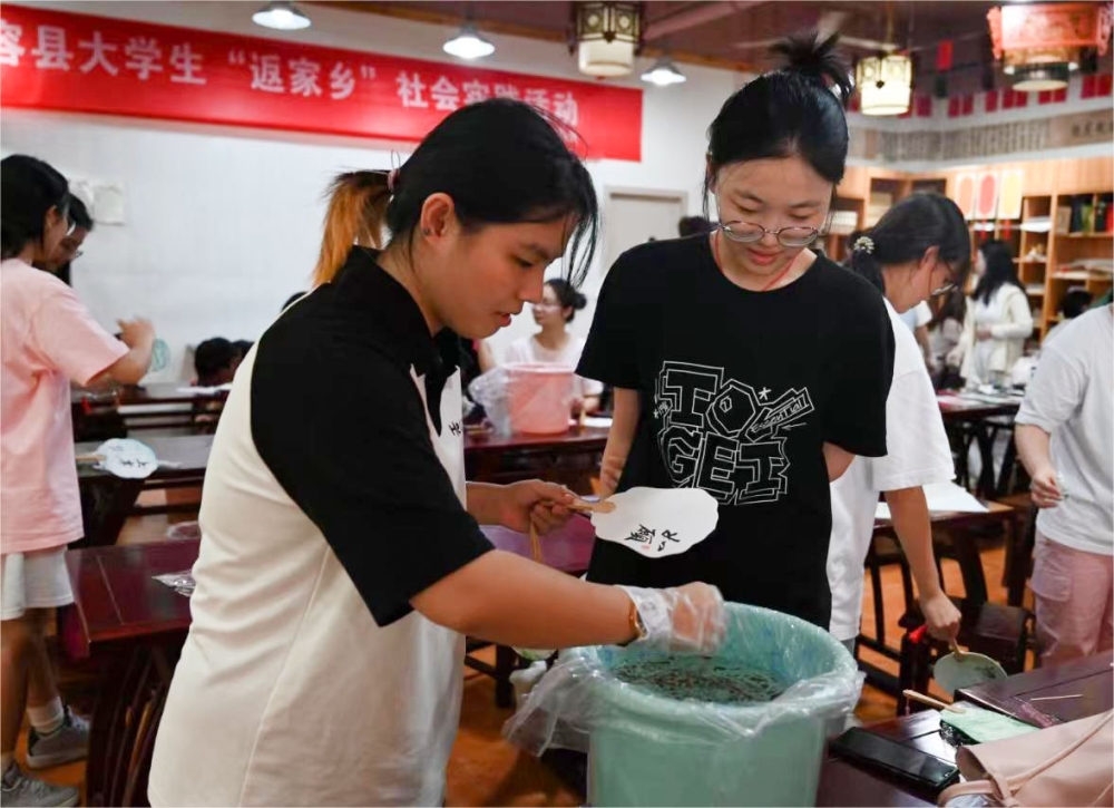 活动现场,大学生们通过选取颜料、比例搭配、调色、浸水上色等步骤,用不同的色彩和丰富的想象力制作出独属于自己的漆扇。