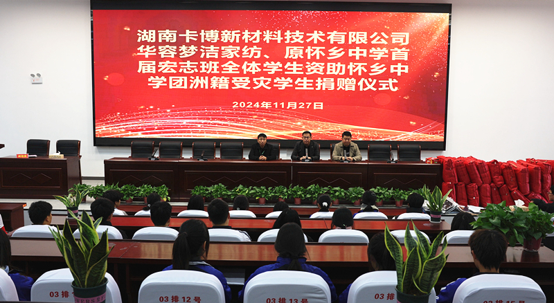 华容融媒体中心讯(记者 杨雅淇)11月27日,一场洋溢着温情与关爱的捐赠仪式在怀乡中学隆重举行。此次捐赠活动由湖南卡博新材料技术有限公司、华容梦洁家纺公司携手原怀乡中学首届宏志班全体学生共同发起,为怀乡中学团洲籍受灾学生提供经济援助和生活物资,帮助他们渡过难关,重拾生活信心。