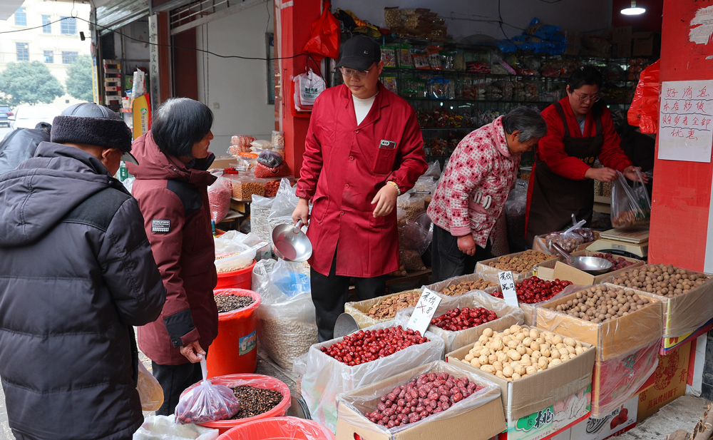 走进南门市场,大红色的春联、福字和中国结在微风中轻轻摇曳,仿佛在诉说着人们对新年的美好祈愿。空气中弥漫着坚果炒货的诱人香气,饱满的瓜子、香甜的点心整齐摆放着。摊主们热情地招揽顾客,手不停地为顾客装袋称重,整个市场热闹非凡。
