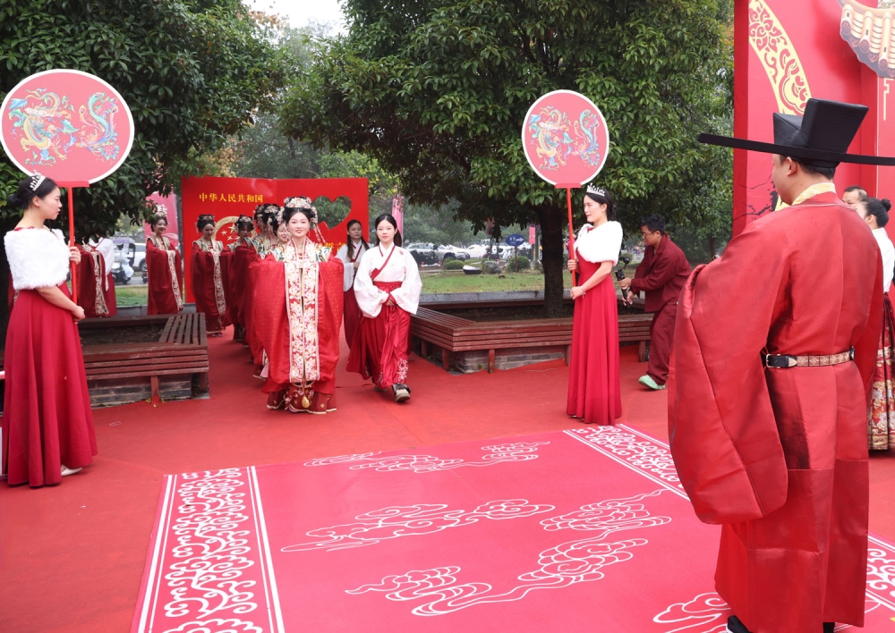 “执子之手,与子偕老”。在古典诗词的深情吟诵中,新人们以传统木雁为信物,寄寓“福禄寿喜”的美好祝愿。四星摆供、五谷丰登、红绸牵缘、诗证山河……这些充满中式浪漫的婚礼仪式,让新人与亲友沉浸式体验中华婚嫁文化的独特魅力,感受传统婚俗的深厚底蕴。