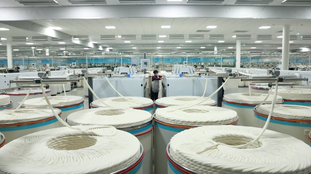 在科创纺织智慧车间,智能纺锤上下飞舞、AGV无人搬运车有序穿行,工人们熟练地进行设备调试与巡检,生产线高效运转。目前,所有车间已全面投产,日产量最高可达240吨。