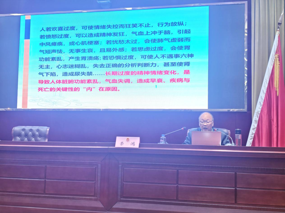 讲座环节,岳阳市职业技术学院中医主任医师、岳阳市老年学会常务副会长荣鸿带来题为《养生先养心》的专题讲座。荣鸿融合中医经典理论与现代医学研究成果,系统阐述了精神心理因素对老年人健康的关键作用,提出“平和、感恩、善良、愉快、开阔、纯净”六种养心良方。针对老年人常见的恐惧焦虑、退休适应、家庭关系等现实问题,他进行了深入浅出的讲解,并提供了切实可行的心理调适建议。
