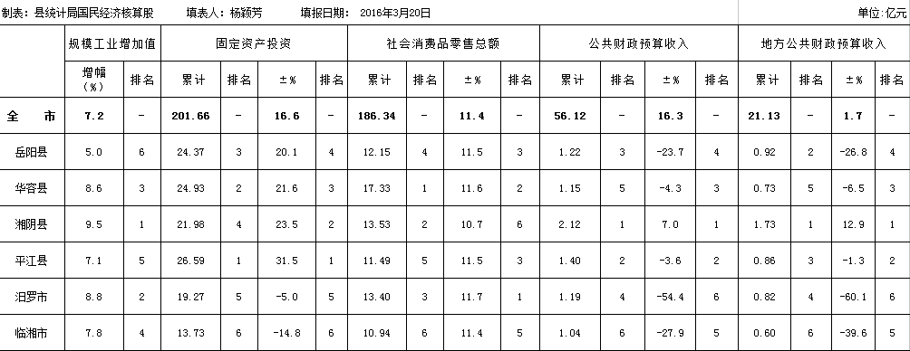 2016年1—2月岳阳市各县(市)区主要经济指标