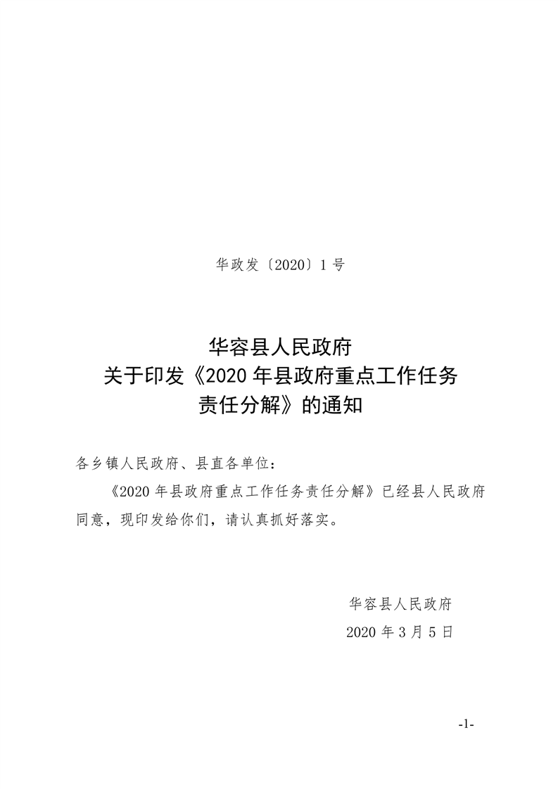 华容县人民政府关于印发《2020年县政府重点工作任务责任分解》的通知