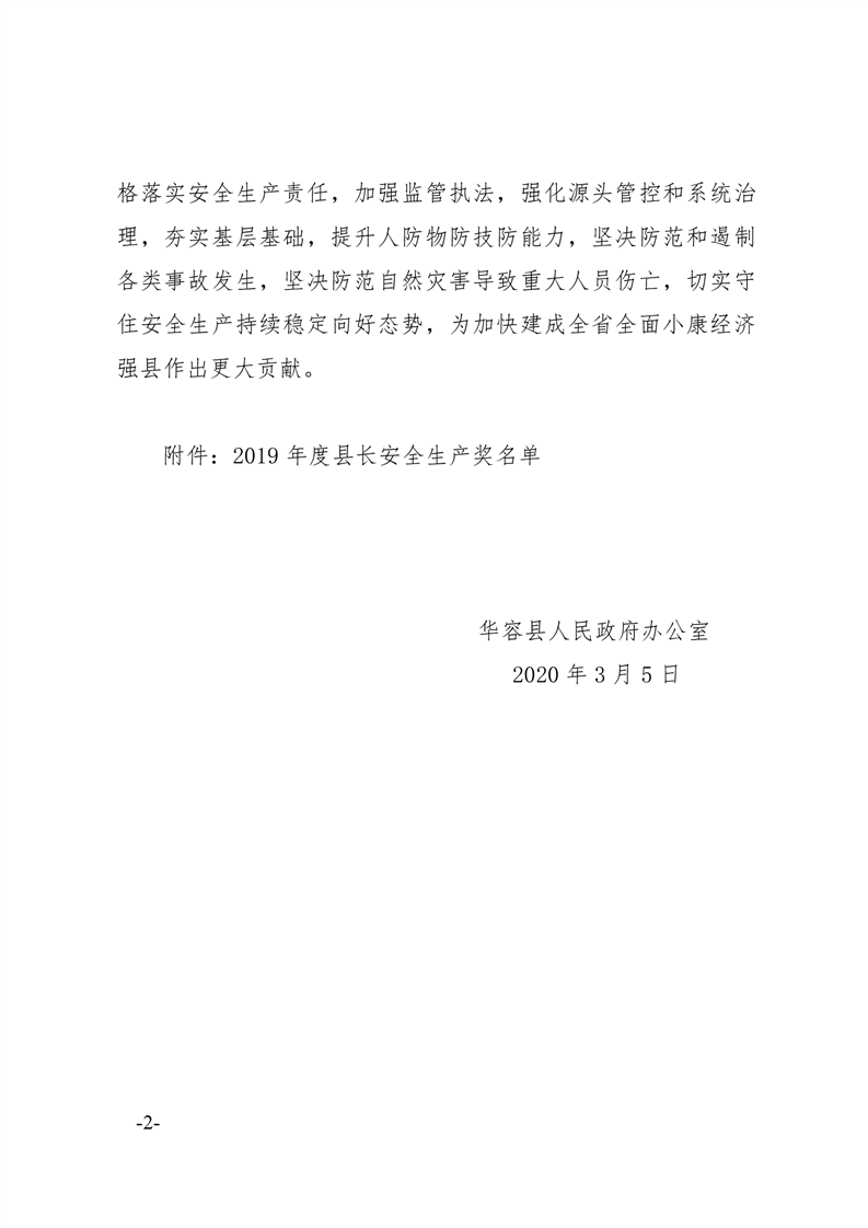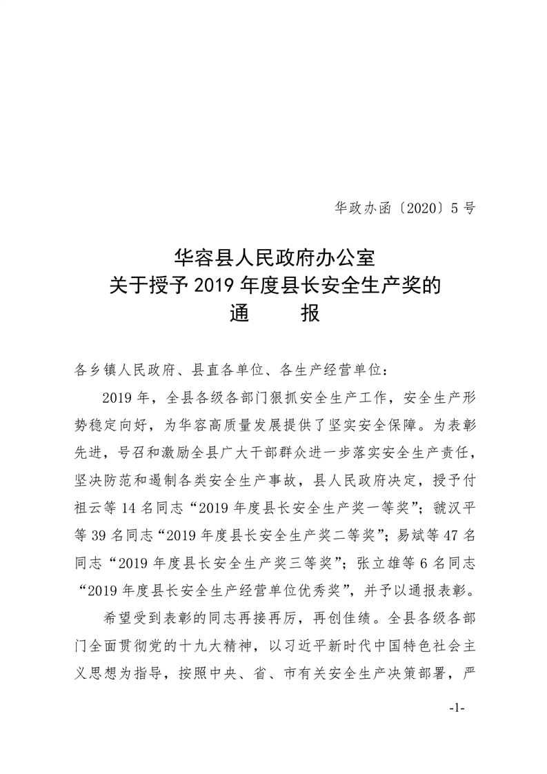 华容县人民政府办公室关于授予2019年度县长安全生产奖的通报