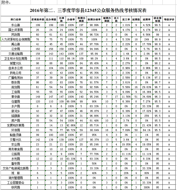 附件:2016年第二、三季度华容县12345公众服务热线考核情况表