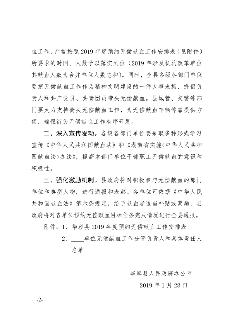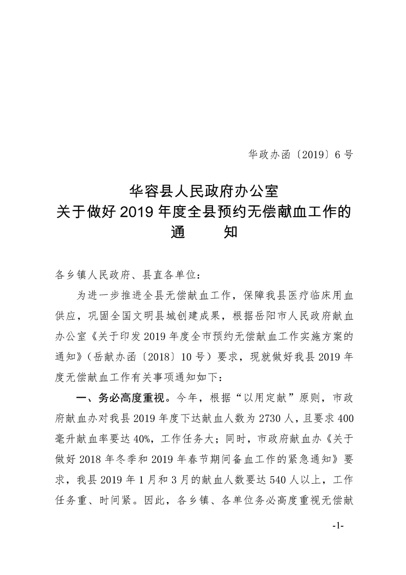 华容县人民政府办公室 关于做好2019年度全县预约无偿献血工作的通知