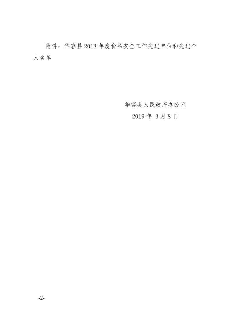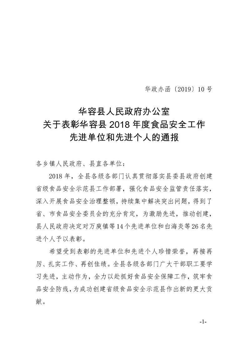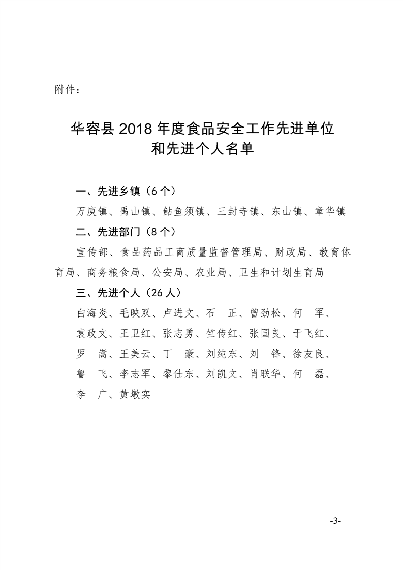 华容县人民政府办公室关于表彰华容县2018年度食品安全工作先进单位和先进个人的通报