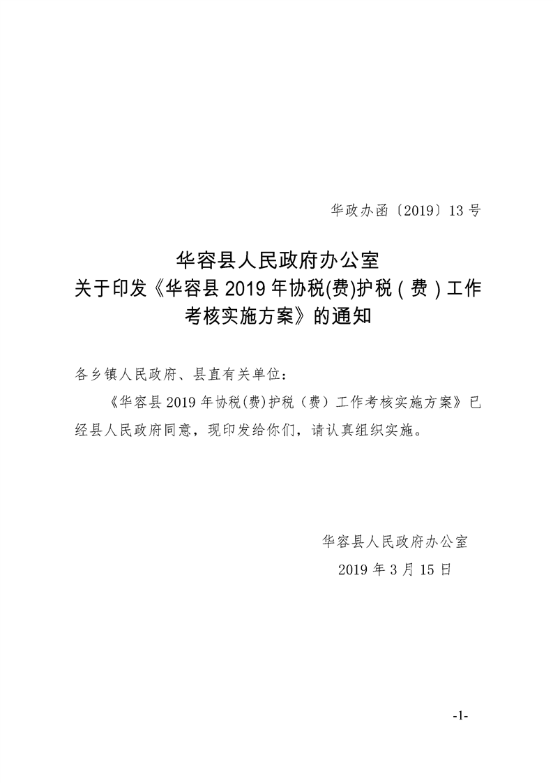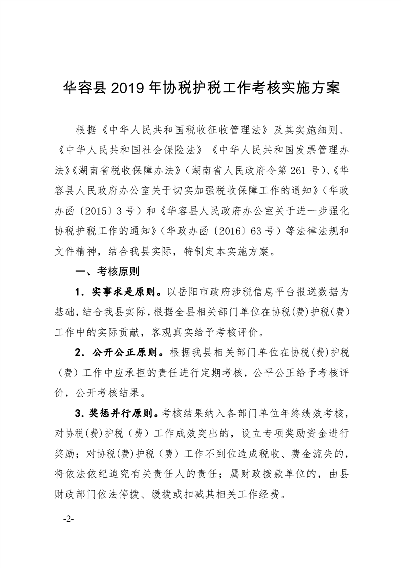 华容县人民政府办公室关于印发《华容县2019年协税(费)护税(费)工作考核实施方案》的通知