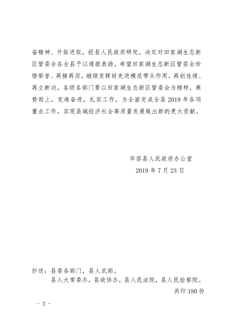 华容县人民政府办公室 关于对田家湖生态新区管委会给予表扬的通报