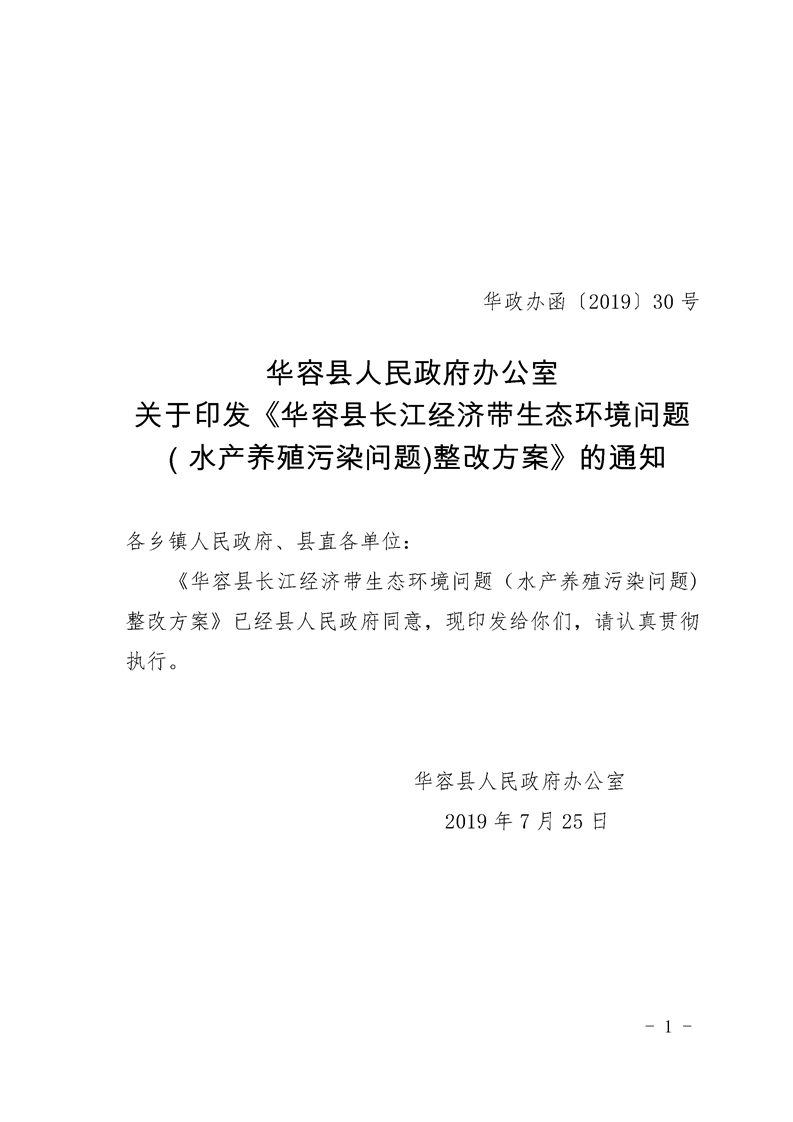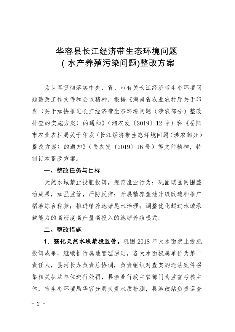 华容县人民政府办公室 关于印发《华容县长江经济带生态环境问题 (水产养殖污染问题)整改方案》的通知