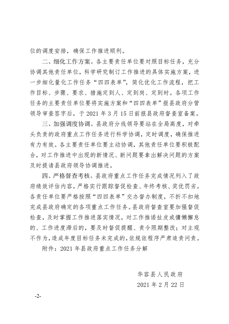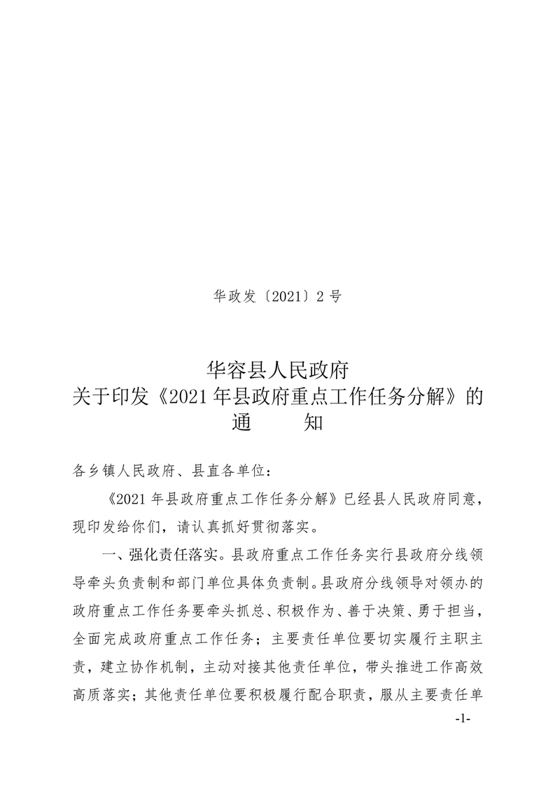 华容县人民政府关于印发《2021年县政府重点工作任务分解》的通 知