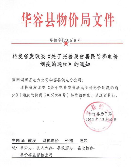 华容县物价局转发省发改委《关于完善我省居民阶梯电价制度的通知》的通知