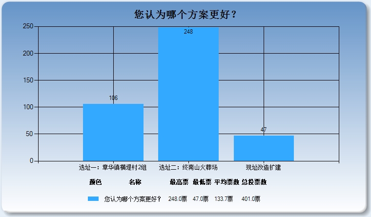 县殡仪馆迁建选址方案网络意见征集共有401位网友参与,调查结果统计如下: