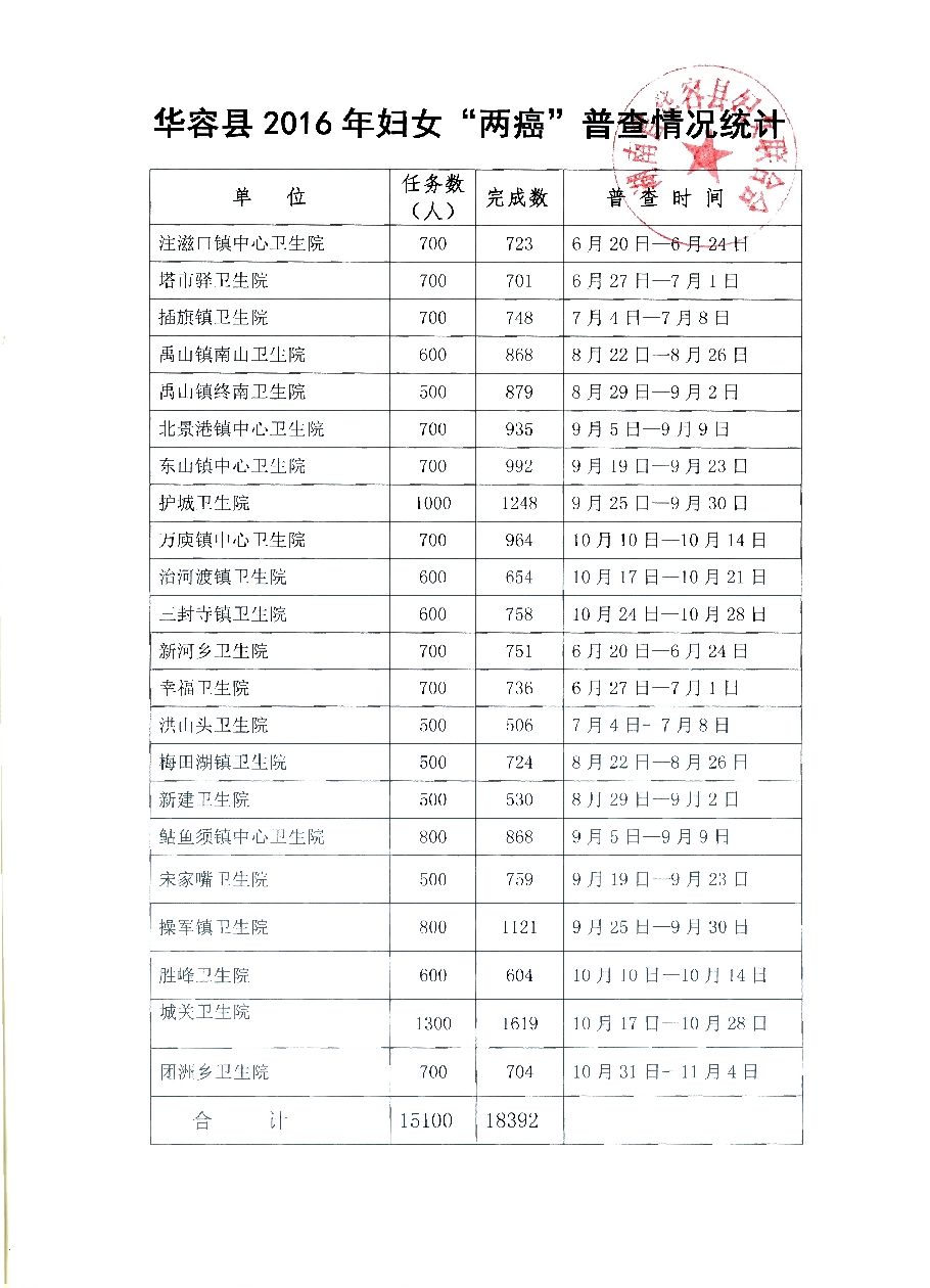 2016年华容县农村妇女“两癌”普查情况统计表公示