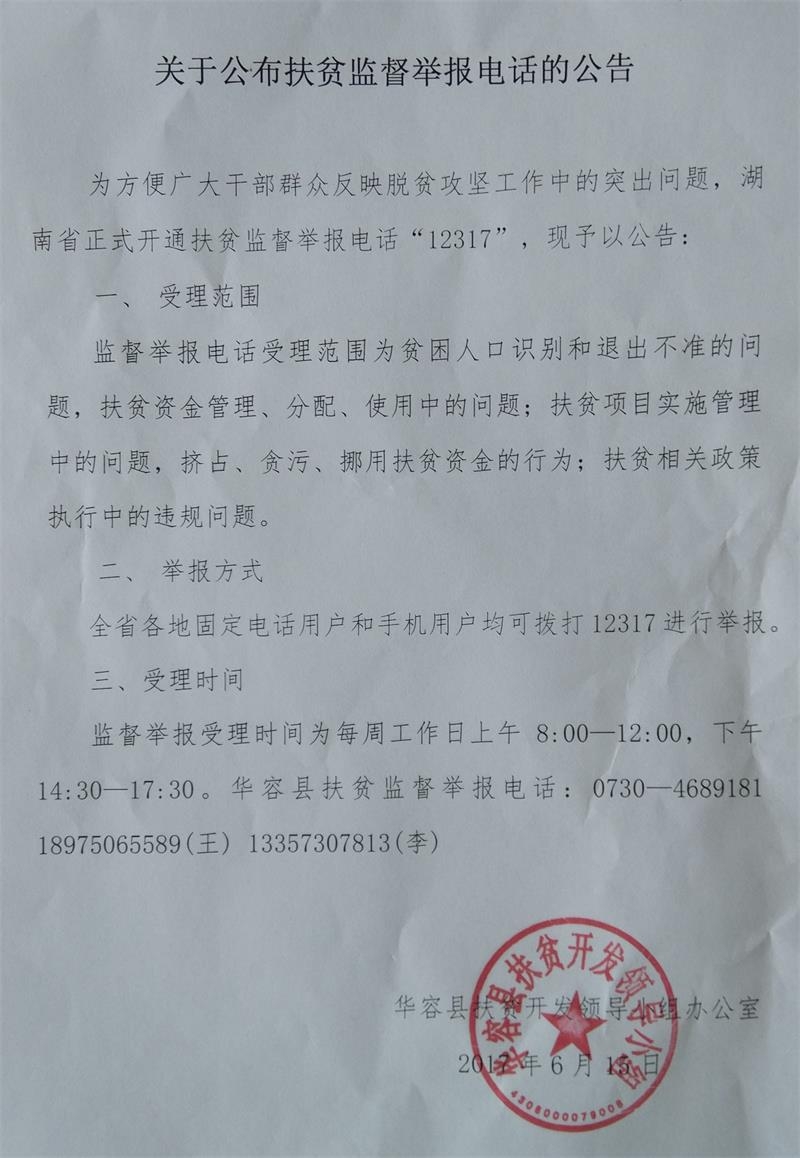 关于公布扶贫监督举报电话的公告
