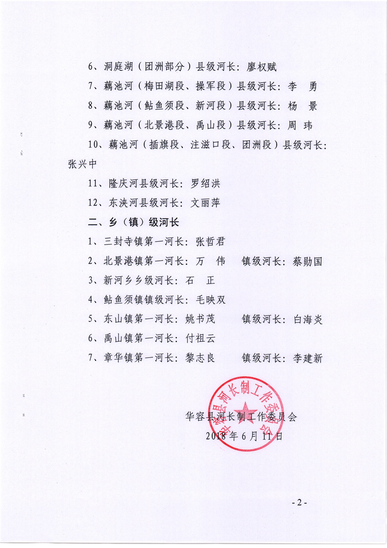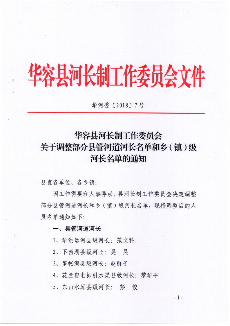 华容县河长制工作委员会关于调整部分县管河道河长名单和乡(镇)级河长名单的通知