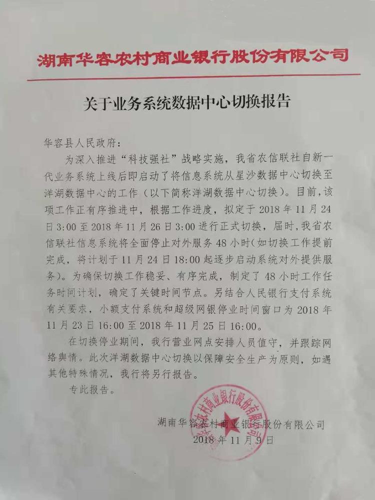 湖南华容农村商业银行关于业务数据切换期间停止服务的公告