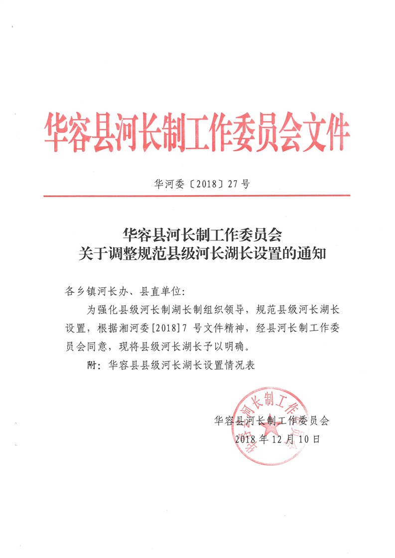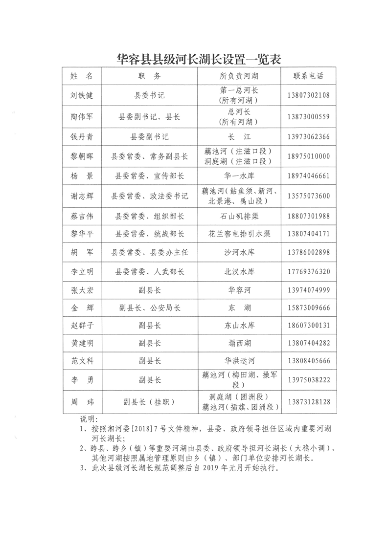 华容县河长制工作委员会关于调整规范县级河长湖长设置的通知