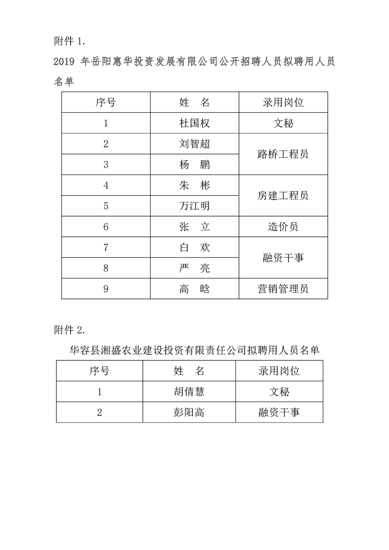 关于岳阳惠华投资发展有限公司 公开招聘人员拟聘用人员的 公 示