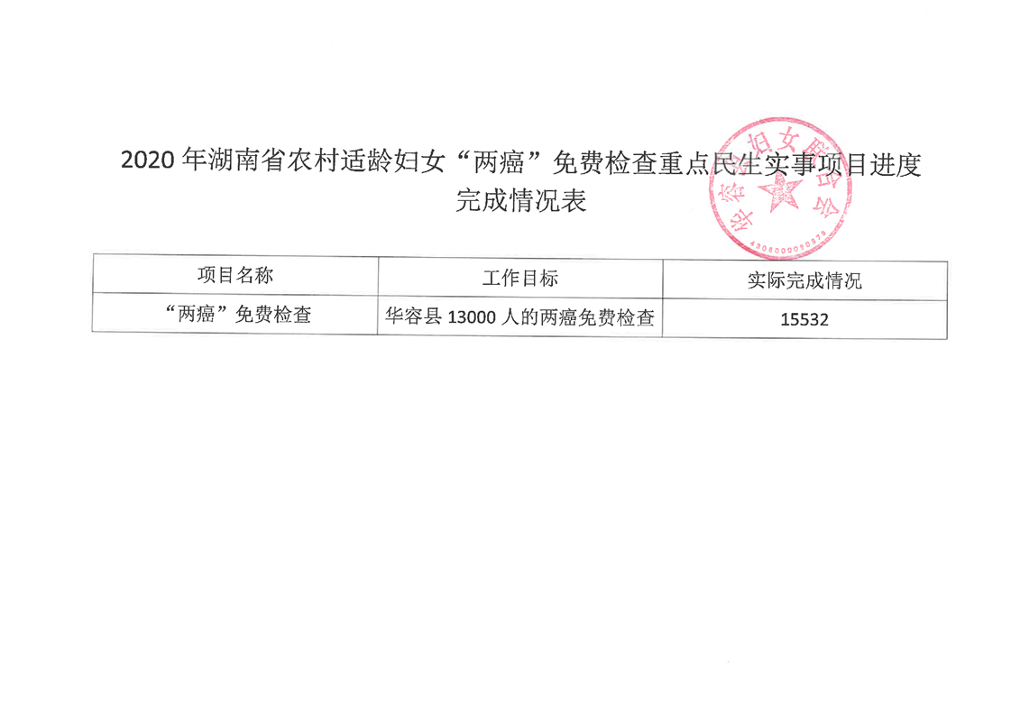 2020年湖南省农村适龄妇女“两癌”免费检查重点民生实事项目进度完成情况表