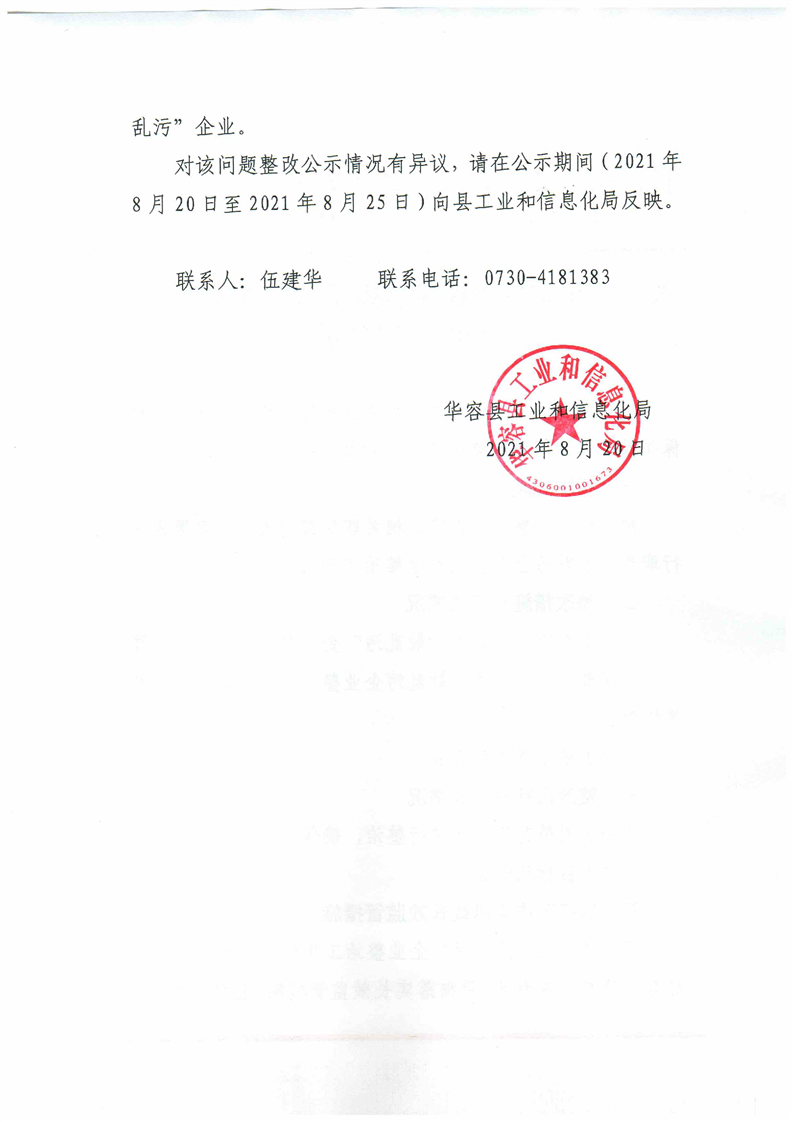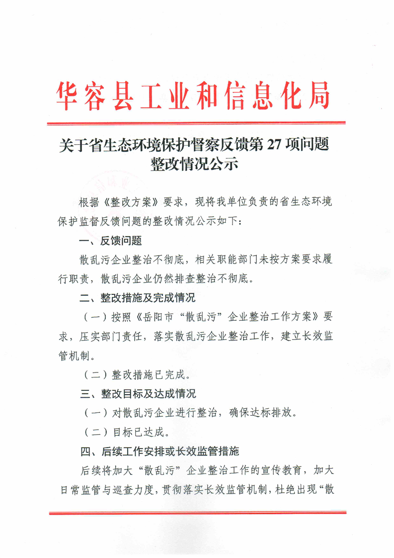 华容县工业和信息化局关于省生态环境保护督察反馈第27项问题整改情况公示