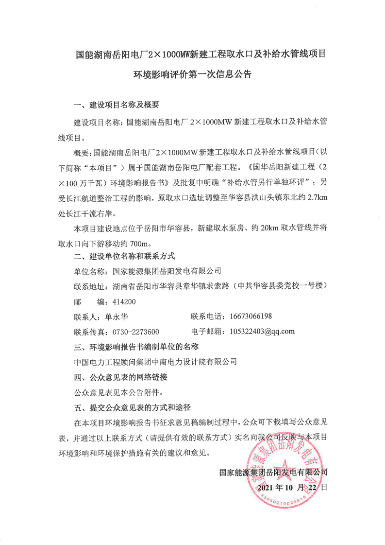 国能湖南岳阳电厂2×1000MW新建工程取水口及补给水管线项目环境影响评价第一次信息公告