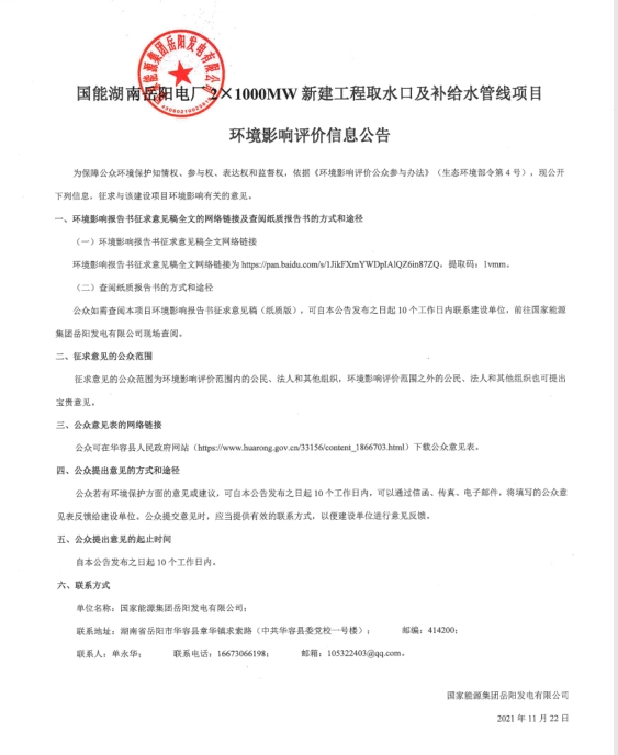 国能湖南岳阳电厂2×1000MW新建工程取水口及补给水管线项目环境影响评价信息公告