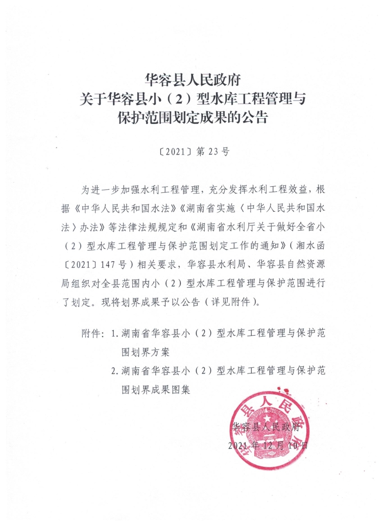 华容县人民政府关于华容县小(2)型水库工程管理与保护范围划定成果的公告