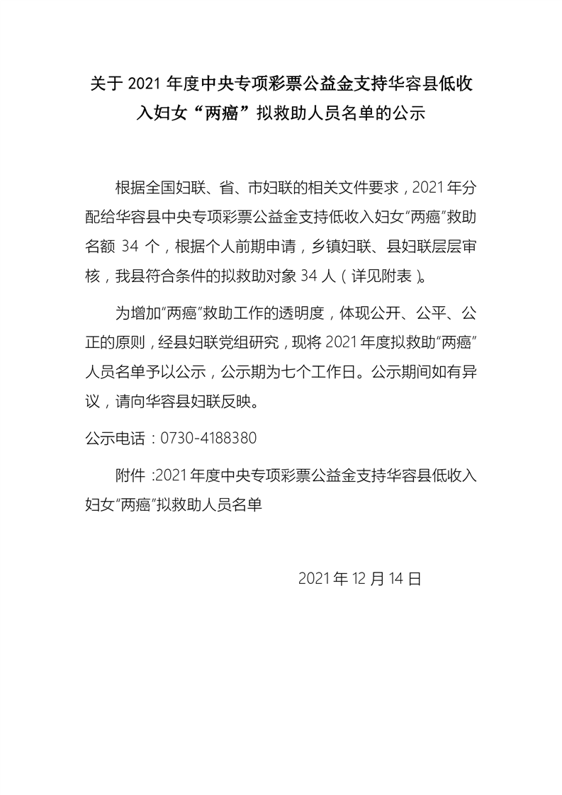 关于2021年度中央专项彩票公益金支持华容县低收入妇女“两癌”拟救助人员名单的公示