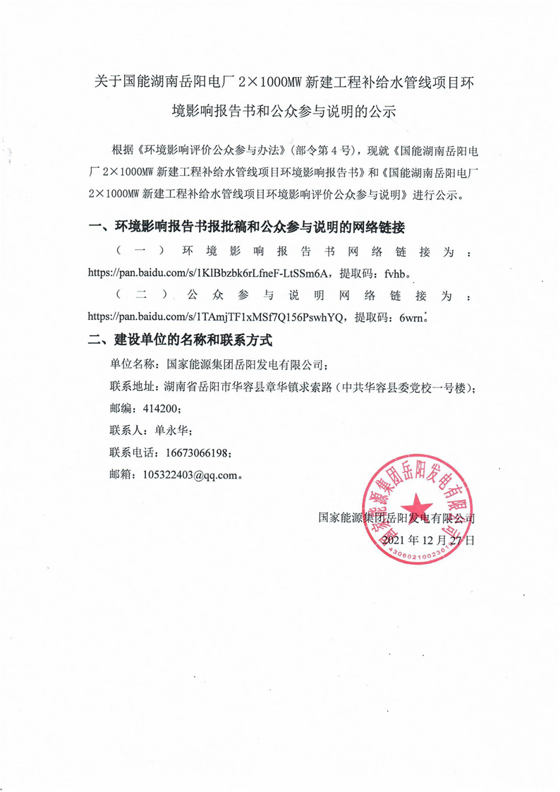 关于国能湖南岳阳电厂2×1000MW新建工程补给水管线项目环境报告书和公众参与说明的公示