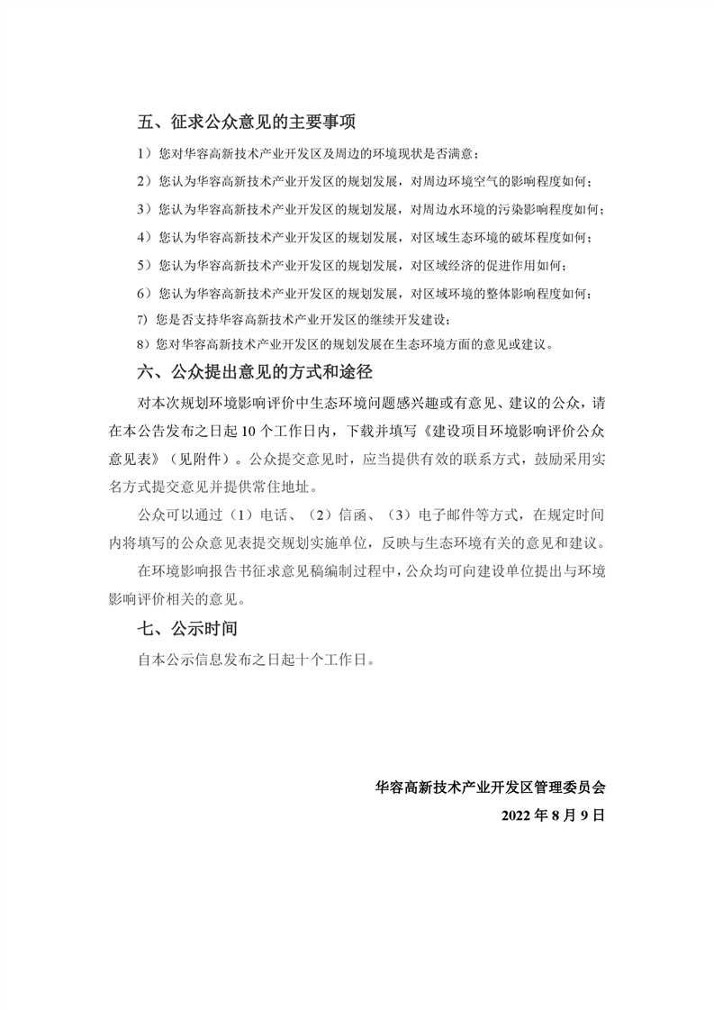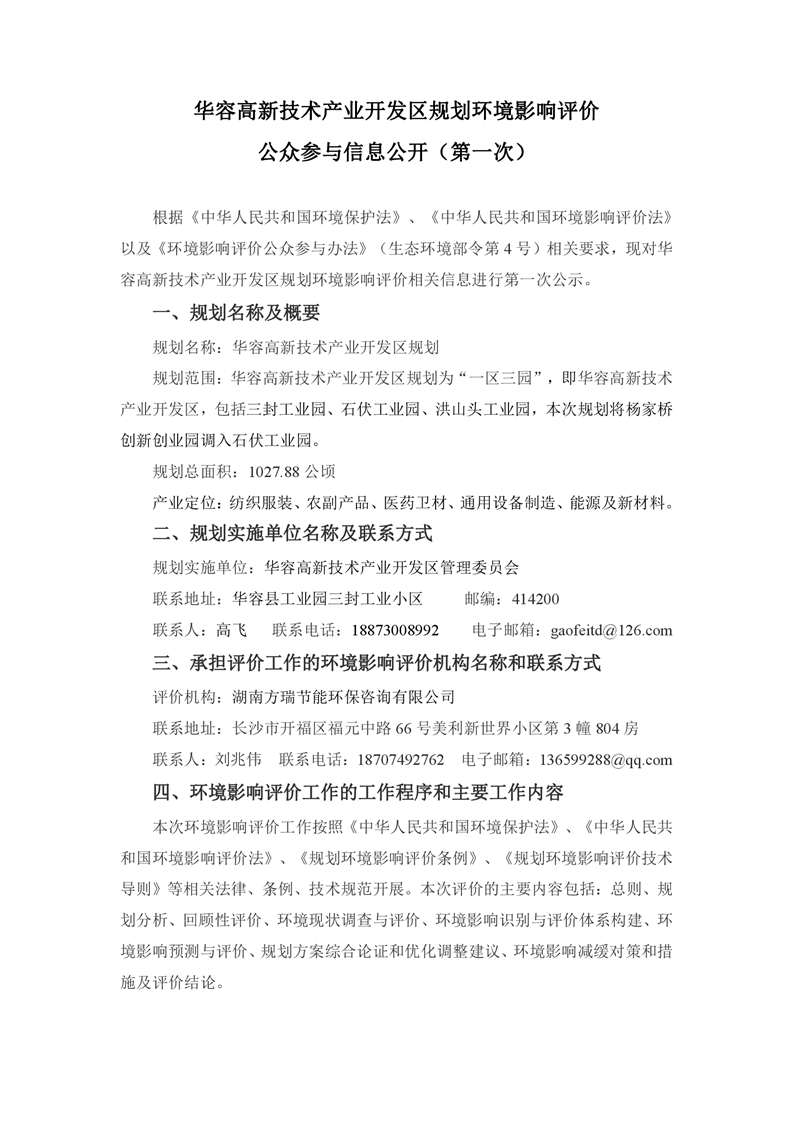 华容高新技术产业开发区规划环境影响评价公众参与信息公开(第一次)