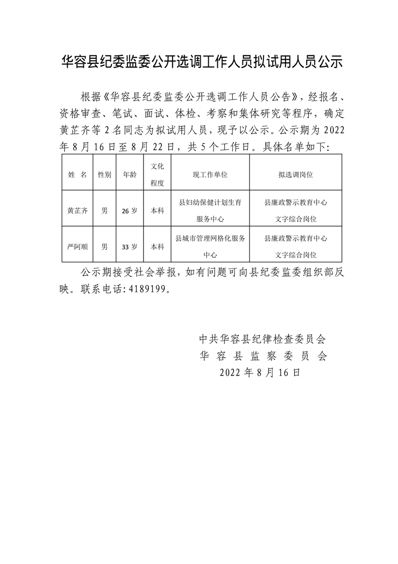 华容县纪委监委公开选调工作人员拟试用人员公示