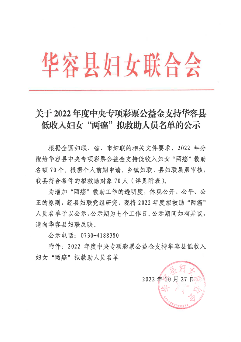 关于2022年度中央专项彩票公益金支持华容县低收入妇女“两癌”拟救助人员名单的公示