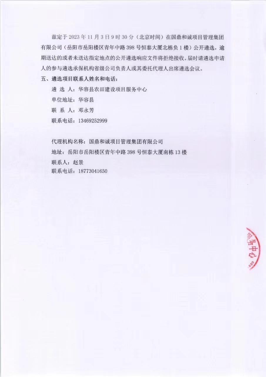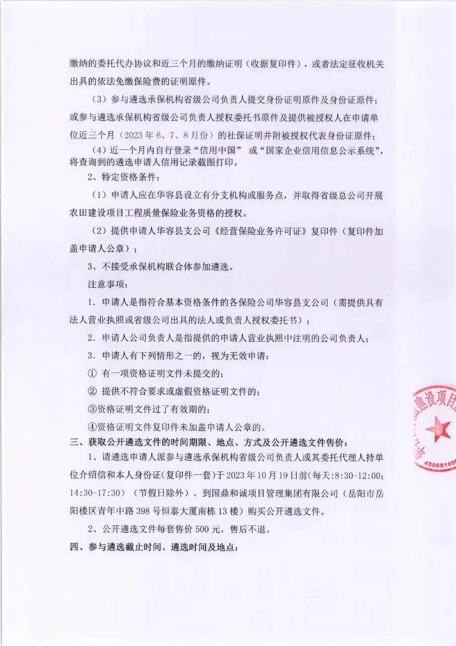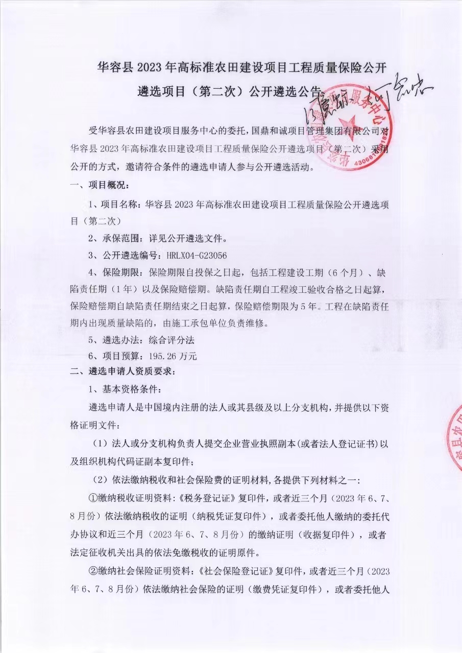 华容县2023年高标准农田建设项目工程质量保险公开遴选项目(第二次)公开遴选公告