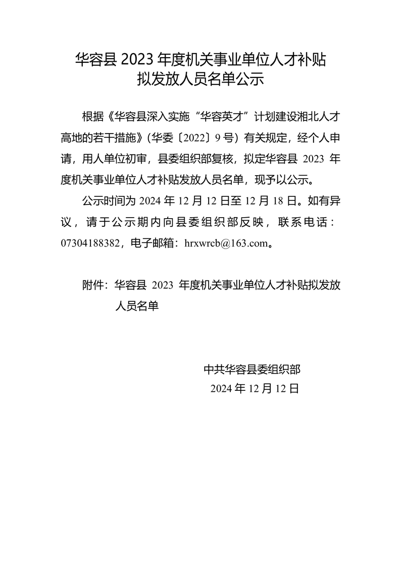 华容县2023年度机关事业单位人才补贴拟发放人员名单公示