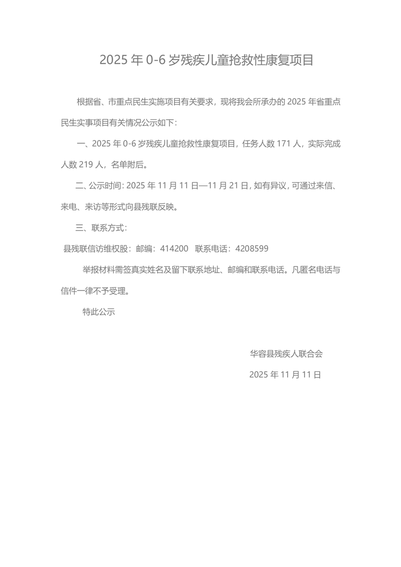 2025年0-6岁残疾儿童抢救性康复项目公示