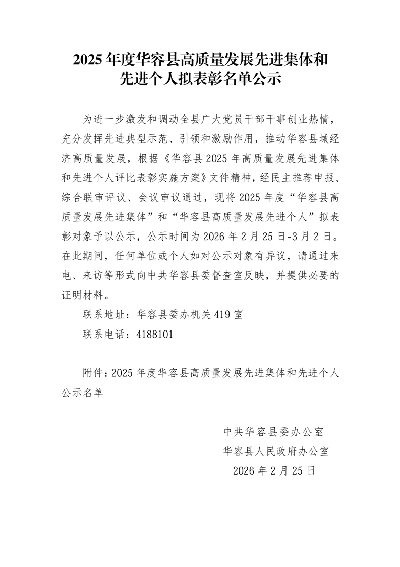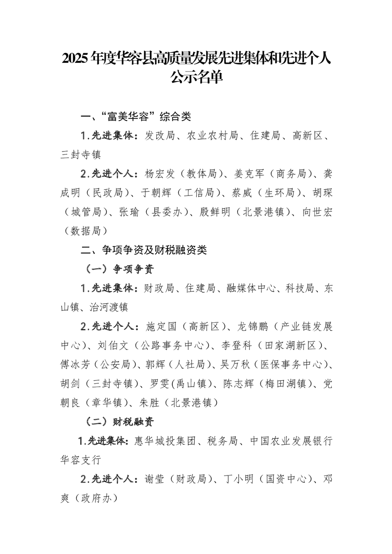 2025年度华容县高质量发展先进集体和先进个人拟表彰名单公示