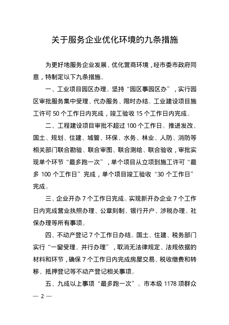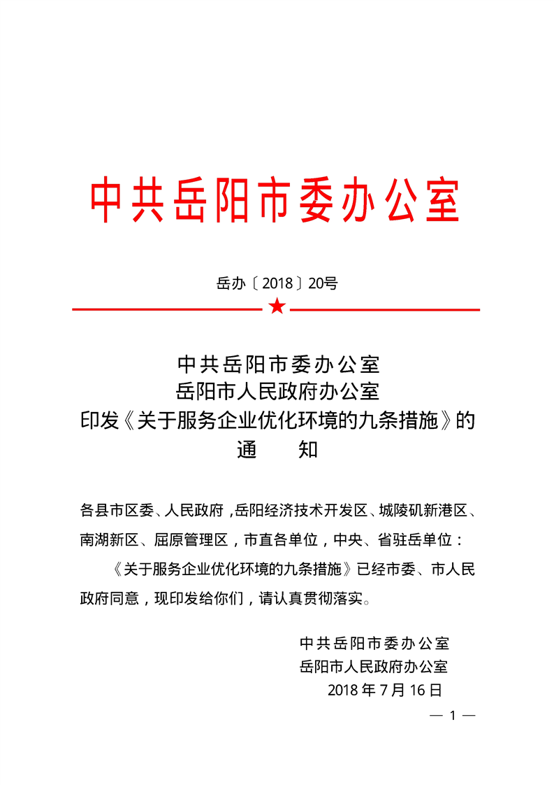 中共岳阳市委办公室 岳阳市人民政府办公室 印发《关于服务企业优化环境的九条措施》的 通 知
