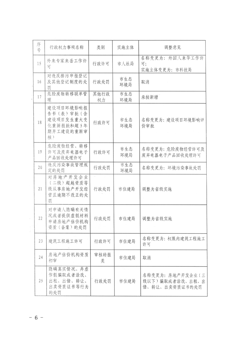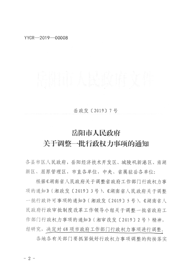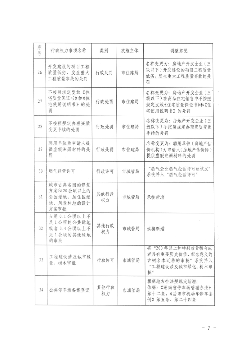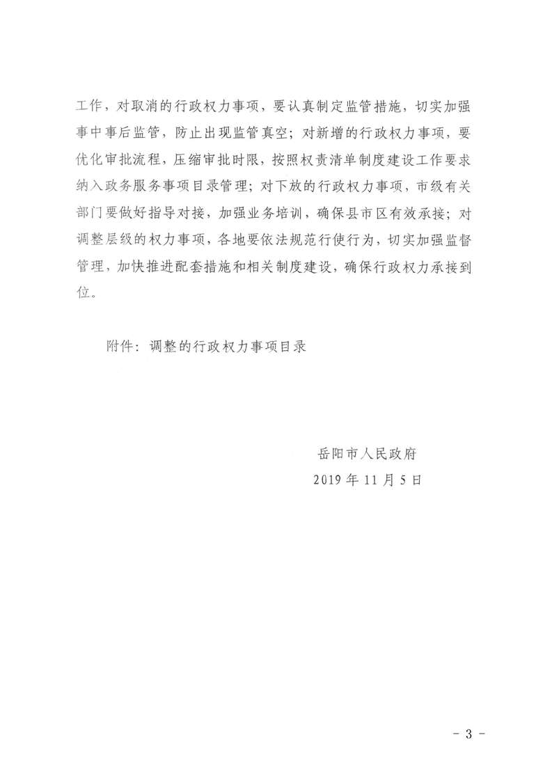 岳阳市人民政府关于 调整一批行政权力事项的通知