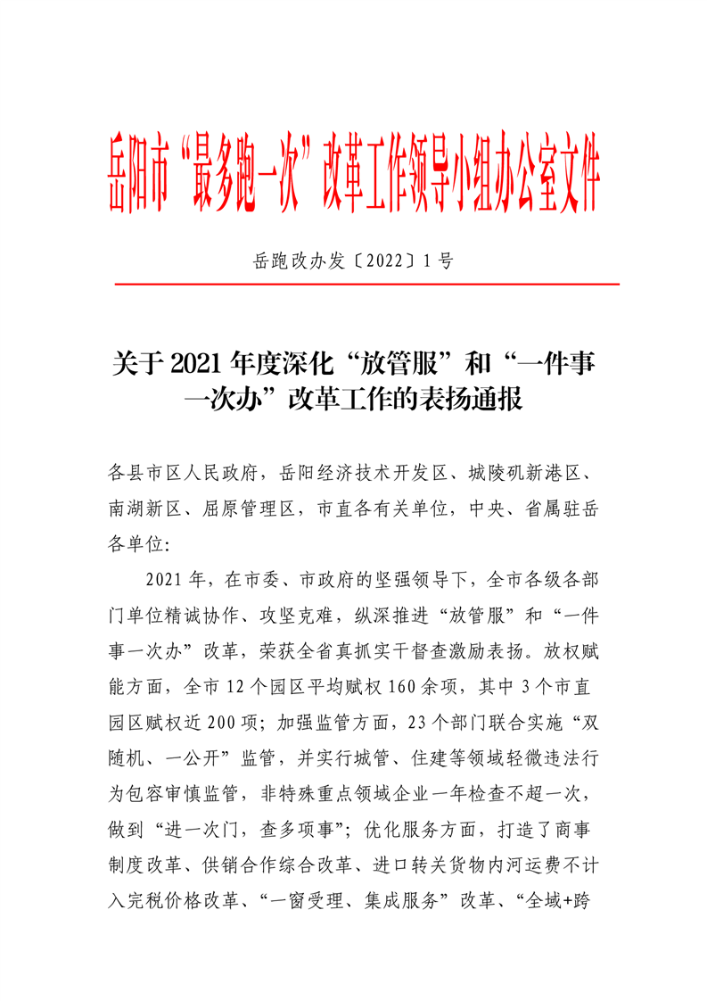 关于2021年度深化“放管服”和“一件事一次办”改革工作的表扬通报