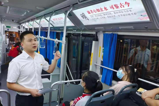 市公交公司在清廉专线公交车车厢内组织青少年学生开展廉洁文化活动。