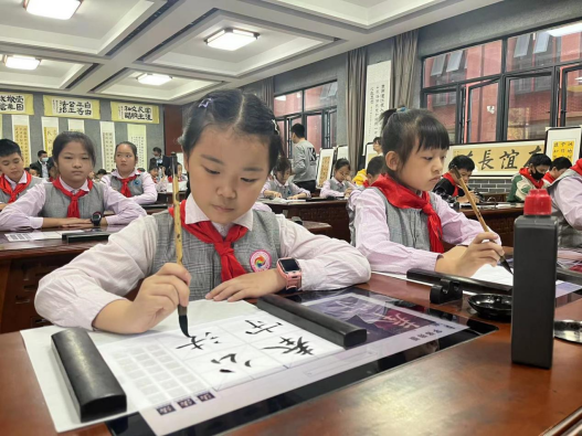 常德市武陵区第一小学学生在书法教室书写廉洁主题汉字。