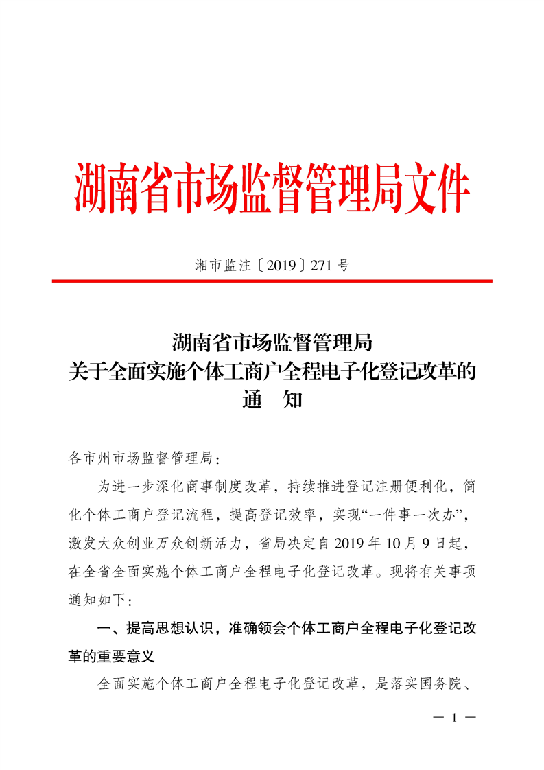 湖南省市场监督管理局 关于全面实施个体工商户全程电子化登记改革的通知