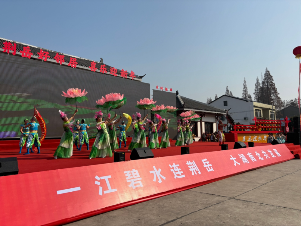 主题村晚活动喜庆热闹,荆州、岳阳的民间艺术团队联合展演夹叶点子、舞龙舞狮等非遗节目。两地文艺家轮番登场,共同表演舞蹈《五虾闹鲇》、快板《石华共赢谱新曲》、情景表演唱《岳州印记》、歌舞小品《洪湖赤卫队》和巴陵戏《巴陵神韵》等特色节目,赢得阵阵掌声。