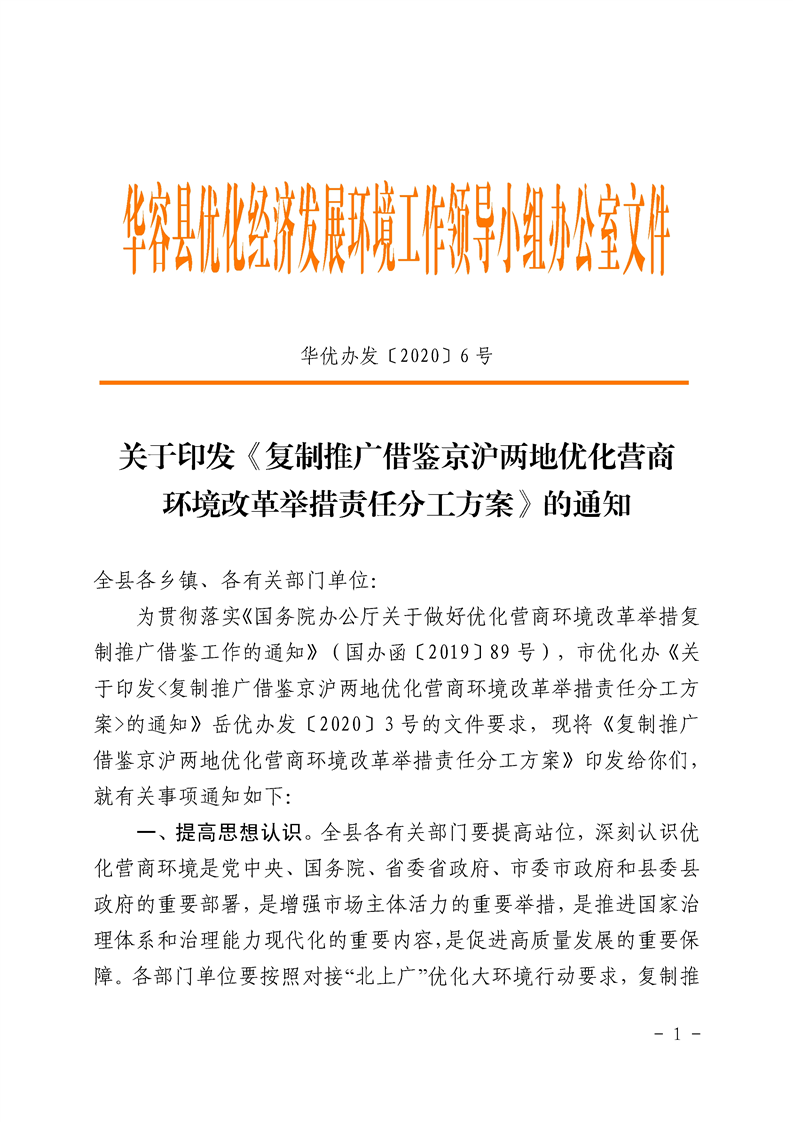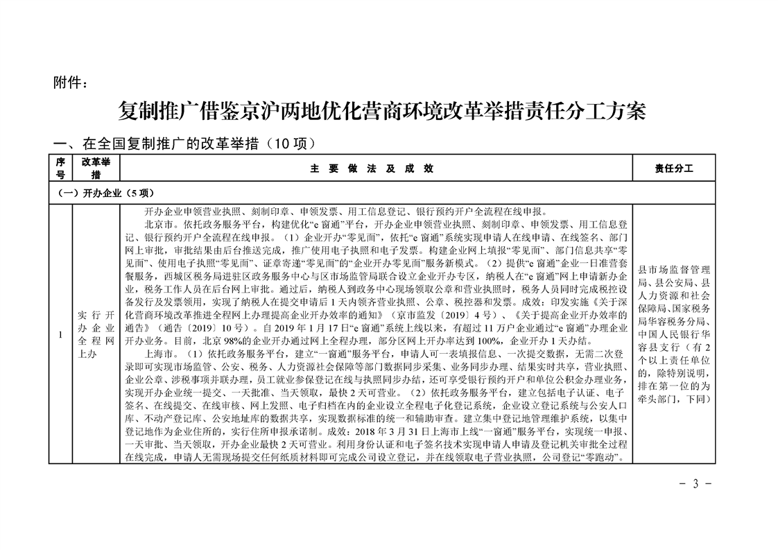 关于印发《复制推广借鉴京沪两地优化营商环境改革举措责任分工方案》的通知