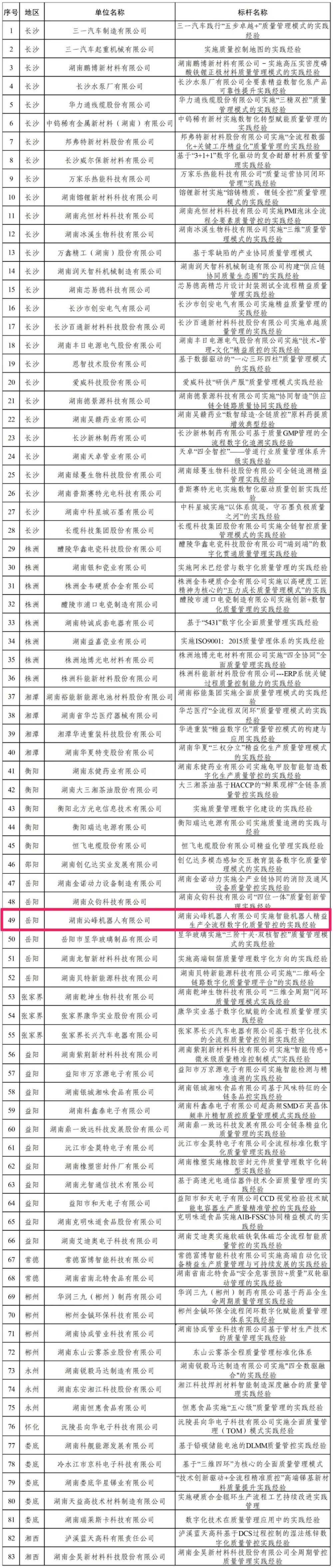 根据《湖南省制造业质量品牌标杆(示范)企业认定管理办法》(湘工信科技〔2022〕273号),经自愿申报、市州工信局初审推荐、专家评审,沁峰机器人、三一汽车制造有限公司等83家企业入围湖南省制造业质量标杆名单,现将名单予以公示。
