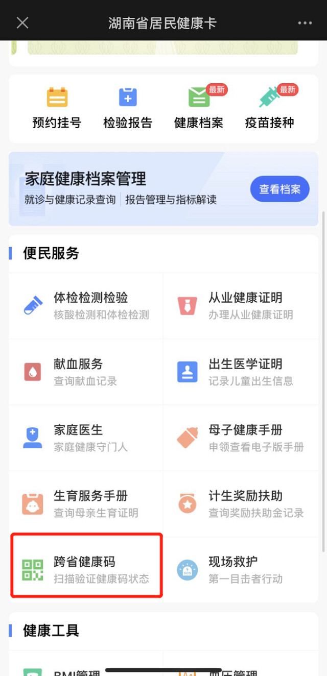 1、进入“湖南省居民健康卡”微信公众号的“健康码”页面,点击“跨省健康码”。