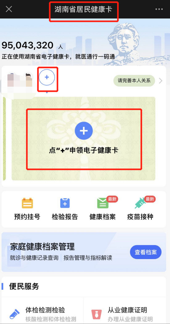 1、进入“湖南省居民健康卡”微信公众号的“健康码”页面,点击“ ”号。